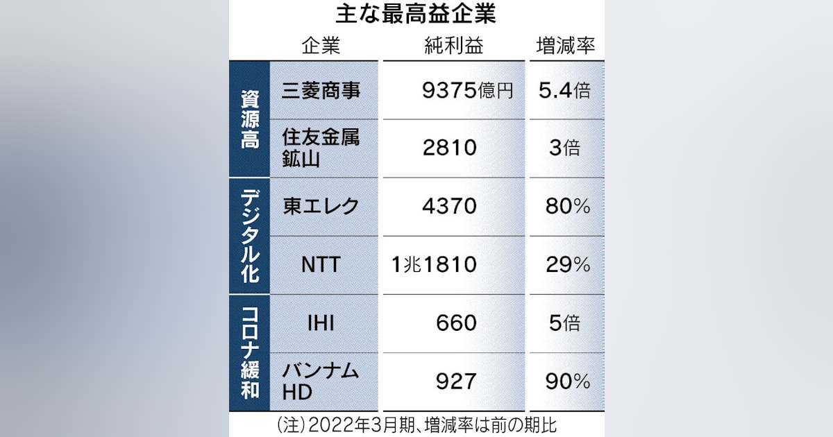 上場企業の決算発表が13日、ピークを迎えた。資源高や円安が追い風となり、2022年3月期に最高益となった企業の比率は30%と約30年ぶりの高水準になった。商社や海運などに加え、IHIなど大手製造業も好調だった。ただ、インフレやウクライナ危機など先行きの懸念材料も多く、今期は価格転嫁などの進捗によって業績の明暗が分かれそうだ。